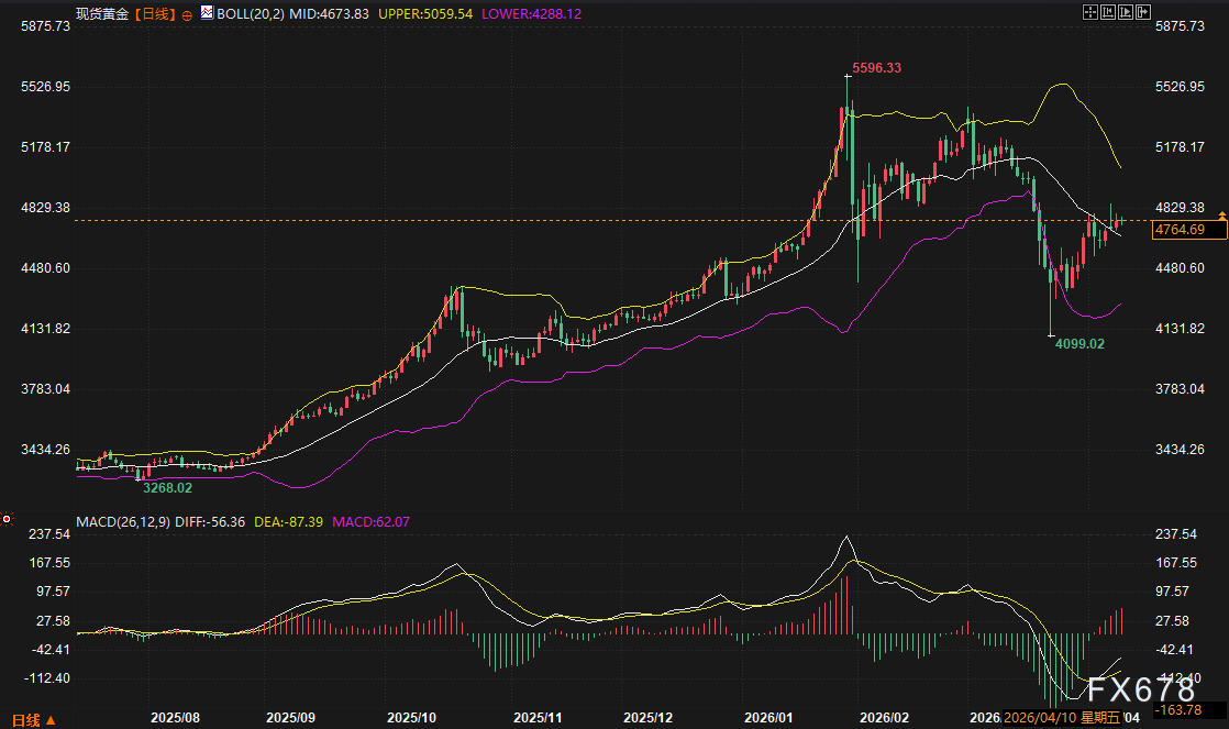 现货黄金目前报 4764.69 美元/盎司。尽管周五因市场获利了结出现小幅贴水,但周线级别的反弹趋势并未扭转。从日线级别看,MACD 在零轴下方形成金叉且红柱放大,表明短期反弹动能依然存在。价格目前企稳于布林带中轨 4673.83 之上,显示出较强的修复韧性。