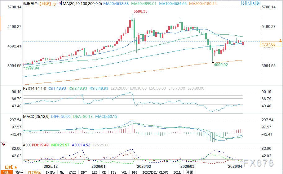 后市关键观察信号:若价格成功站稳50日均线上方,短期看涨势头将增强,下一阻力位指向前期高点附近的5000-5200美元区间;反之,若价格失守100日均线支撑,下方支撑将首先考验4600-4500美元区间,若进一步下探,则需关注200日均线(约4180美元)的强支撑作用。