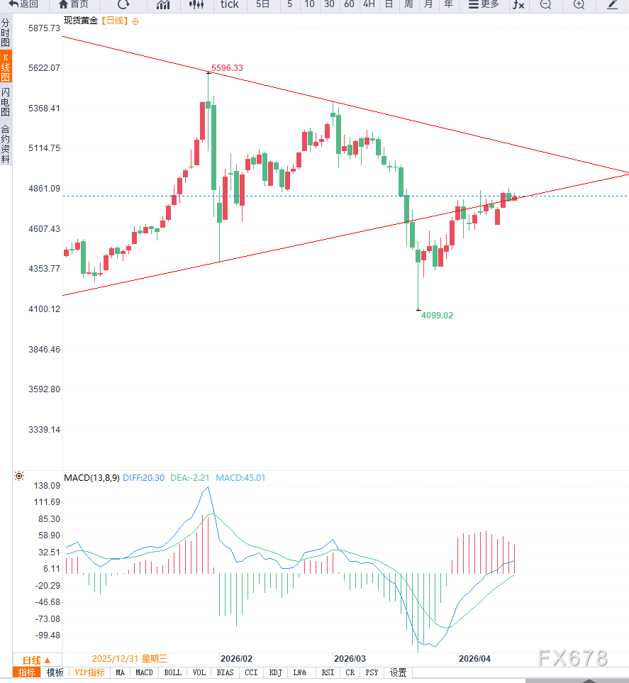 短周期4小时图显示,黄金价格在冲高后进入调整通道,MACD指标出现死叉并持续向下,表明短线空头动能占优。若价格无法重新站稳4850美元上方,则短期仍有下探支撑区域的风险;反之,若重新突破4900美元,则有望恢复上行趋势。