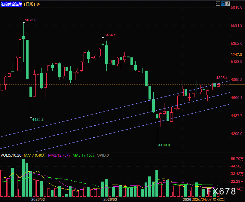 技术面纽约黄金期货连续显示近期黄金价升量缩,表明增量资金较少且底部资金未明显出逃,但缺少换手暗示反弹高度有限,目前金价持续受制于上升通道上轨,如果全球通胀反弹,各国国债收益率回升,黄金可能会展开回调,或者美伊停火得到延续,金价或继续反弹迎来兑现窗口。
