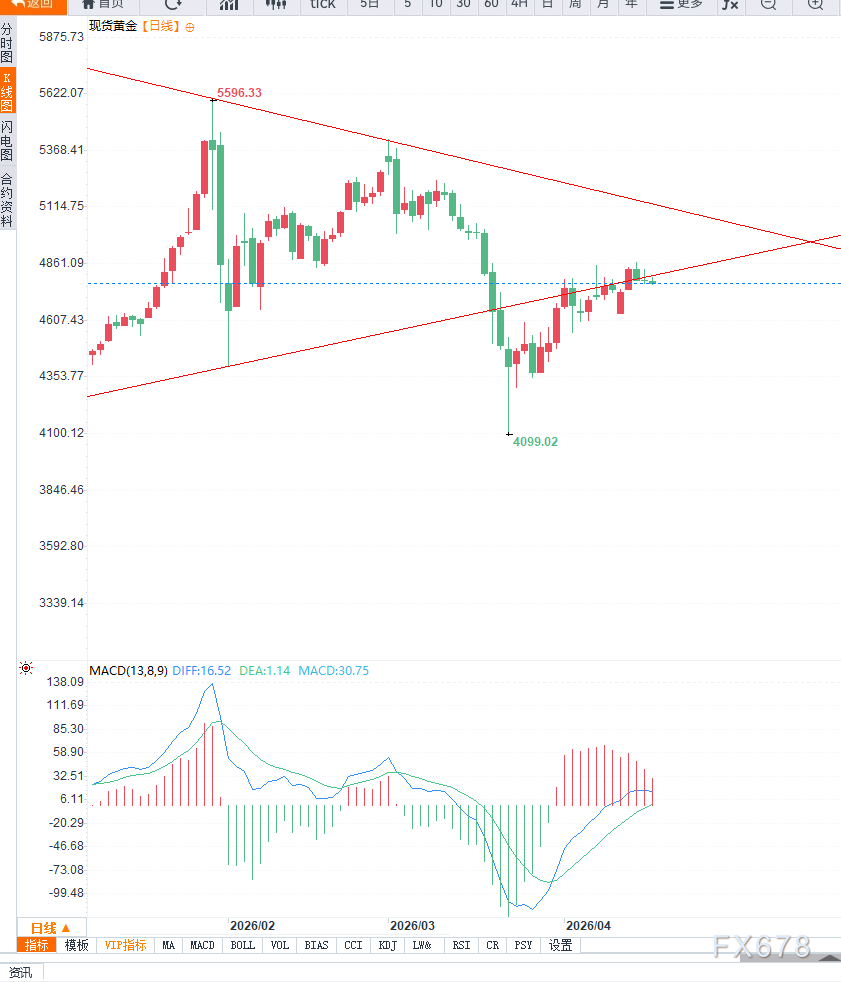 从技术面来看,日线级别上,黄金价格在高位震荡区间内运行,整体趋势仍偏多,但上涨动能有所放缓。价格在4800美元关口附近多次受阻,显示上方抛压较强。动能指标方面,相对强弱指数(RSI)自高位回落至中性区域,MACD指标出现高位钝化,暗示上涨动能减弱。关键结构上,下方支撑位位于4750美元及4680美元区域,若跌破可能引发进一步回调;上方阻力关注4800美元及4850美元区域,若有效突破则可能打开新一轮上涨空间。