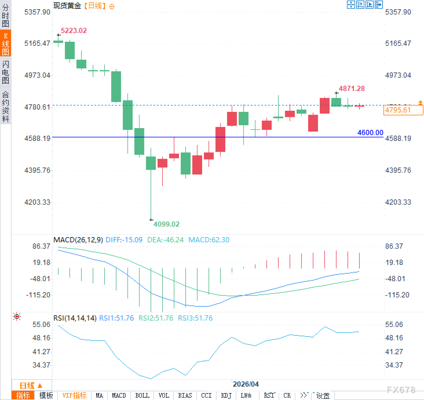 汇通财经APP讯——4月17日周五,现货黄金市场呈现窄幅震荡格局,价格徘徊在4795美元每盎司附近。地缘政治层面,美伊停火协议进入关键窗口期,谈判乐观预期虽存但不确定性突出,同时美联储维持中性政策立场,因能源价格高企与经济数据韧性而暂未转向宽松信号。这两大因素共同压制了黄金的上涨动能,整体缺乏明确突破方向,价格在通道内反复整理,下行空间有限而上行动力受限。