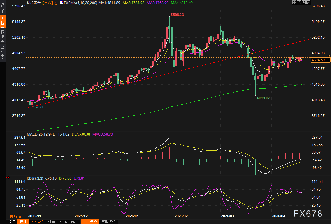 汇通财经APP讯——在全球金融市场神经高度紧绷的当下,黄金作为最经典的避险资产,其价格波动从未像现在这样牵动人心。刚刚过去的周一(4月19日),现货黄金上演了一出惊心动魄的“V型”反转剧——盘中一度跌至一周低点,随后又顽强反弹。这背后,不仅仅是数字的跳动,更是地缘政治风暴、美元走势变脸以及全球能源市场剧烈震荡交织作用的结果。周二(4月20日)亚市早盘,现货黄金窄幅震荡,目前交投于4825美元/盎司附近。