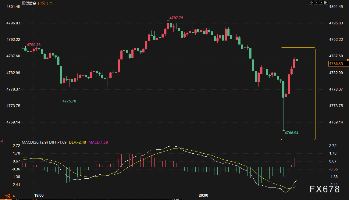 现货黄金的表现则更为典型。在数据公布后的前五分钟内,由于美元走强和利率预期波动,金价短线下挫约14美元,最低触及4766.94美元。随后,基于对通胀风险的对冲需求以及地缘不确定性的考量,买盘迅速介入,金价反弹20.50美元,回升至4787美元附近。这种V型走势凸显了金价在强数据下的韧性。