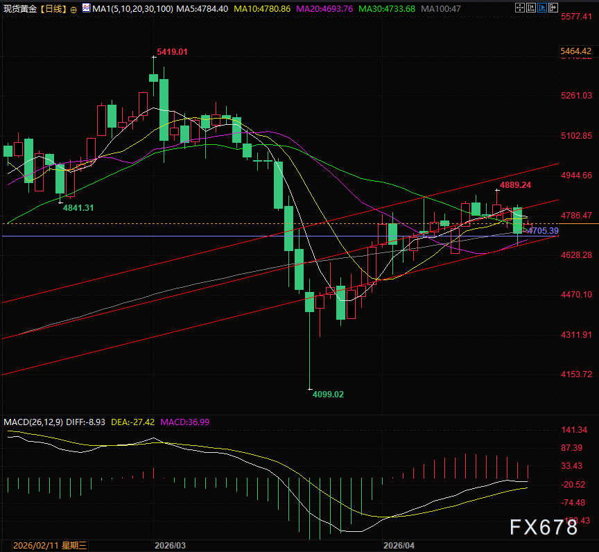 汇通财经APP讯——周三(4月22日)亚欧时段,黄金走出反弹走势,周二纽约时段黄金一度跳水至3%,美伊停火协议延长消息落地后,美元持续承压,黄金(XAU/USD)顺势刷新日内高点,自4705美元的支撑位开启反弹。