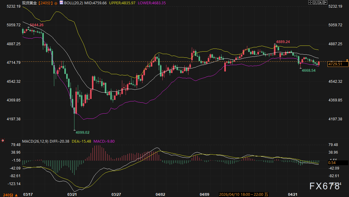 现货黄金在 240 分钟周期图表上表现出清晰的回调轨迹。目前报价约 4729.51,处于布林带中轨(4759.66)与下轨(4683.35)之间的弱势区域。MACD 指标显示,DIFF 与 DEA 双线均处于零轴下方,且绿柱持续释放,暗示空头动能短期占据主导。尽管柱值收窄预示下跌动能有所减弱,但缺乏足够的多头反转信号。
