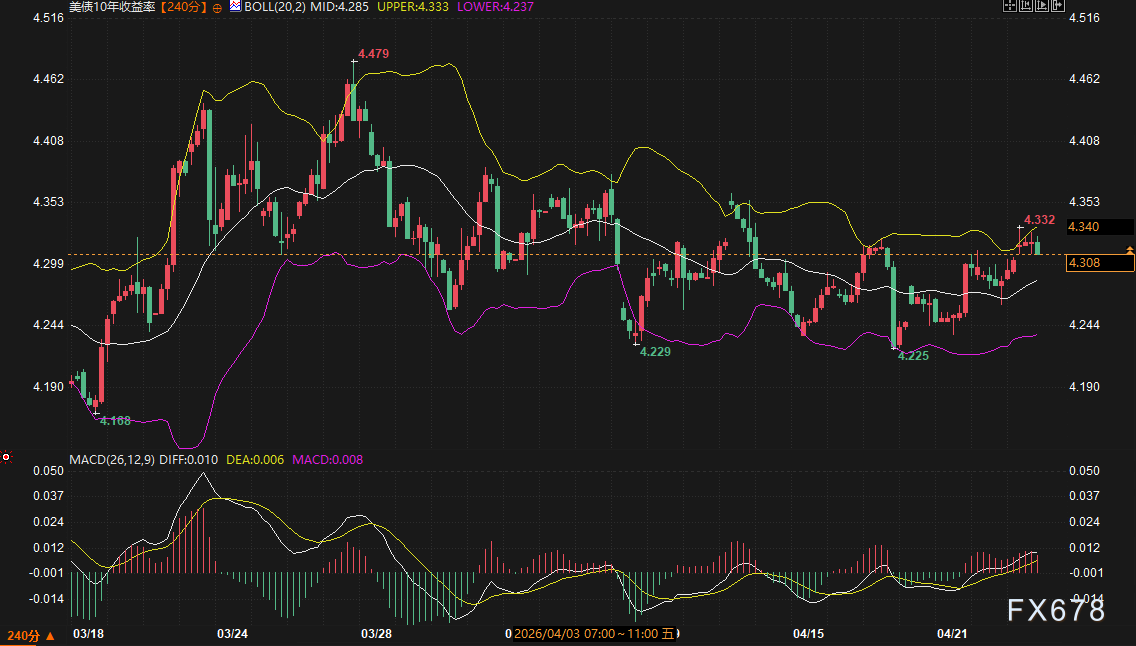 美债 10 年期收益率近期展现出强劲的上攻势头,最新动态报价已触及 4.340%。在 240 分钟周期中,MACD 出现金叉,且价格运行于布林带中轨(4.285)与上轨(4.333)之间,表现出明显的多头排列。知名机构调查显示,受能源冲击引发的通胀反弹影响,联储降息的时间窗口可能推迟六个月,这种预期差直接支撑了美元的汇率表现。