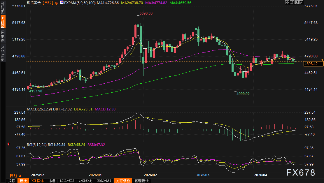 汇通财经APP讯——中东地缘局势持续动荡,国际油价持续上涨,打压美联储降息预期,美元指数走强,周四(4月23日)现货黄金在震荡中一度触及每盎司4664.28美元,创下近两周新低,虽然盘中曾受黎巴嫩和以色列可能延长停火的消息提振而收复全部失地,但尾盘依旧不敌强势美元,最终收报4694.07美元,全天跌幅约1%。周五(4月24日)亚市早盘,现货黄金窄幅震荡,目前交投于4697美元/盎司附近,市场将继续关注中东局势的相关消息,并开始留意下周的央行“盛宴”。