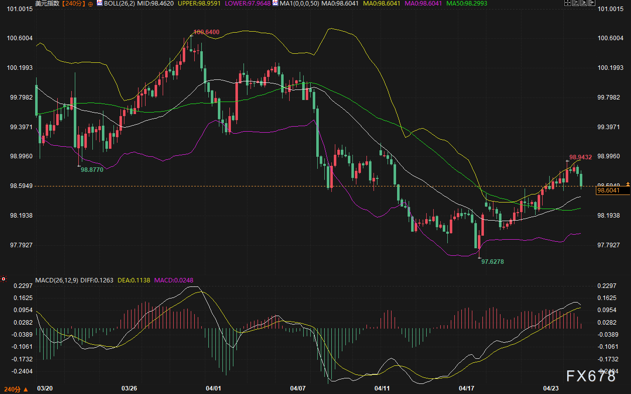 汇通财经APP讯——周五(04月24日),当前全球金融市场呈现出明显的避险情绪与通胀预期交织的特征。受近期地缘政治局势升级影响,原油价格表现强劲,一度逼近 98 美元关口。受此带动,美债收益率与美元指数呈现震荡上行态势,而现货黄金则在前期大幅冲高后陷入技术性回调。由于下周即将迎来议息会议,美联储目前处于缄默期,市场焦点集中于今日发布的密歇根大学消费者信心指数。初步数据显示,受相关局势引起的通胀预期上升影响,消费者信心处于历史低位,这种宏观背景为大宗商品与外汇市场的短期波动定下了复杂基调。