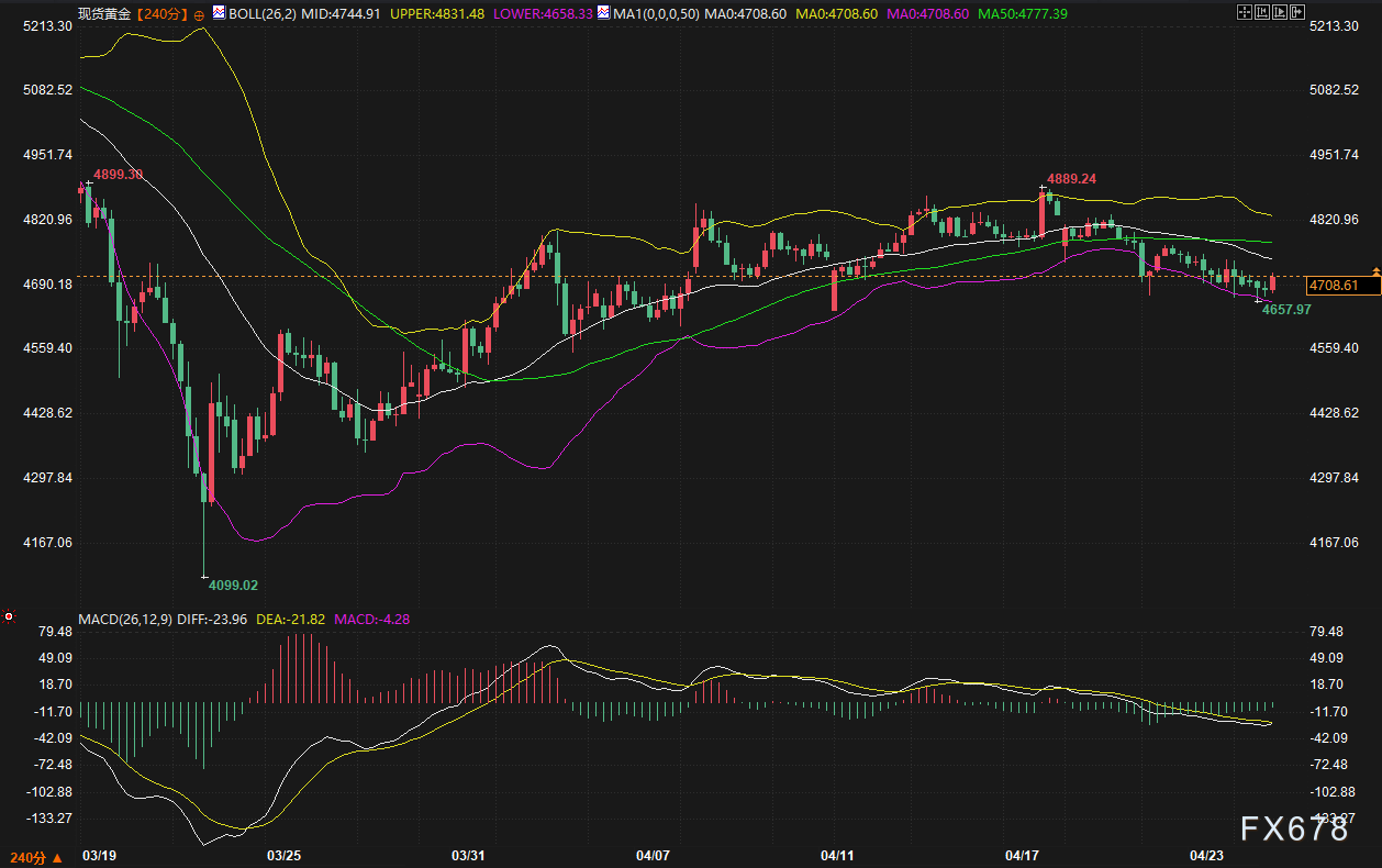 现货黄金走势与原油、美元呈现出一定的背离。在 3 月下旬创下 4899 美元的高点后,金价目前处于明显的下行通道中。当前报价 4708 美元左右,价格运行于所有均线下方,技术面极度偏空。MACD 在零轴下方持续放大绿柱,暗示空头抛压尚未完全释放。