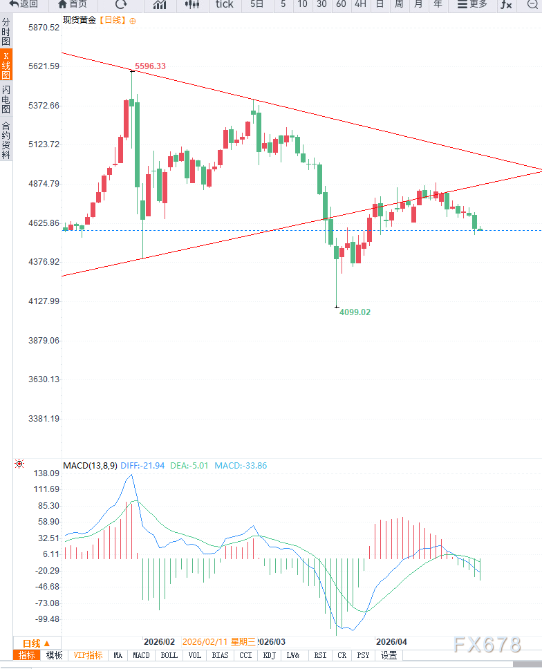 从技术结构来看,黄金日线级别维持高位震荡上行格局,价格运行于主要均线系统上方,显示整体趋势仍偏多运行,下方4550美元构成关键支撑区域,上方4650美元为短期重要阻力区间,若有效突破该位置,或将打开进一步上行空间。从动能指标观察,多头动能虽仍占主导,但已出现边际放缓迹象,表明高位追涨意愿有所下降。从4小时周期来看,价格处于收敛整理区间,短线波动收窄,RSI指标接近中性水平,显示市场正在等待新的驱动因素指引方向。若突破4620美元,短线可能测试上方阻力,否则不排除回踩4550美元支撑的可能。