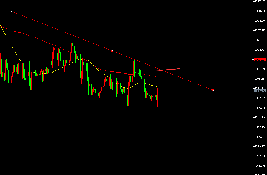 4小时图小台阶震荡下跌当中,目前的高点向下移,形成下行趋势。次高点在3360.趋势线的阻力下移至3350.小周期震荡向下。今日操作依托3360做为防守点,反弹先行短空,亚盘在3345附近空防守3355目标看3315-3300.