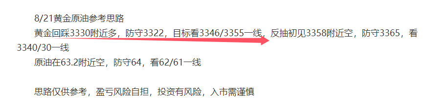 目前市场整体情绪紧张,因为俄乌三方谈判并不顺利,阶段性陷入了僵局,后续的话需要关注谈判进度,然后美联储九月份降息预期逐步落地,也需要关注利好的落地情况,黄金也是维持我们近期跟大家分享的震荡整理走势,早盘小幅反抽3346附近震荡回落,欧盘时段一波快速回落到3325附近然后迅速回升, 跟大家分享的3330附近多单目前也是反弹兑现到了第一目标位3345附近,大家注意保护利润,短期继续看整理走势,回踩3328附近继续多,关注3358/60附近压力情况,区间来回做,不过分追涨杀跌即可。