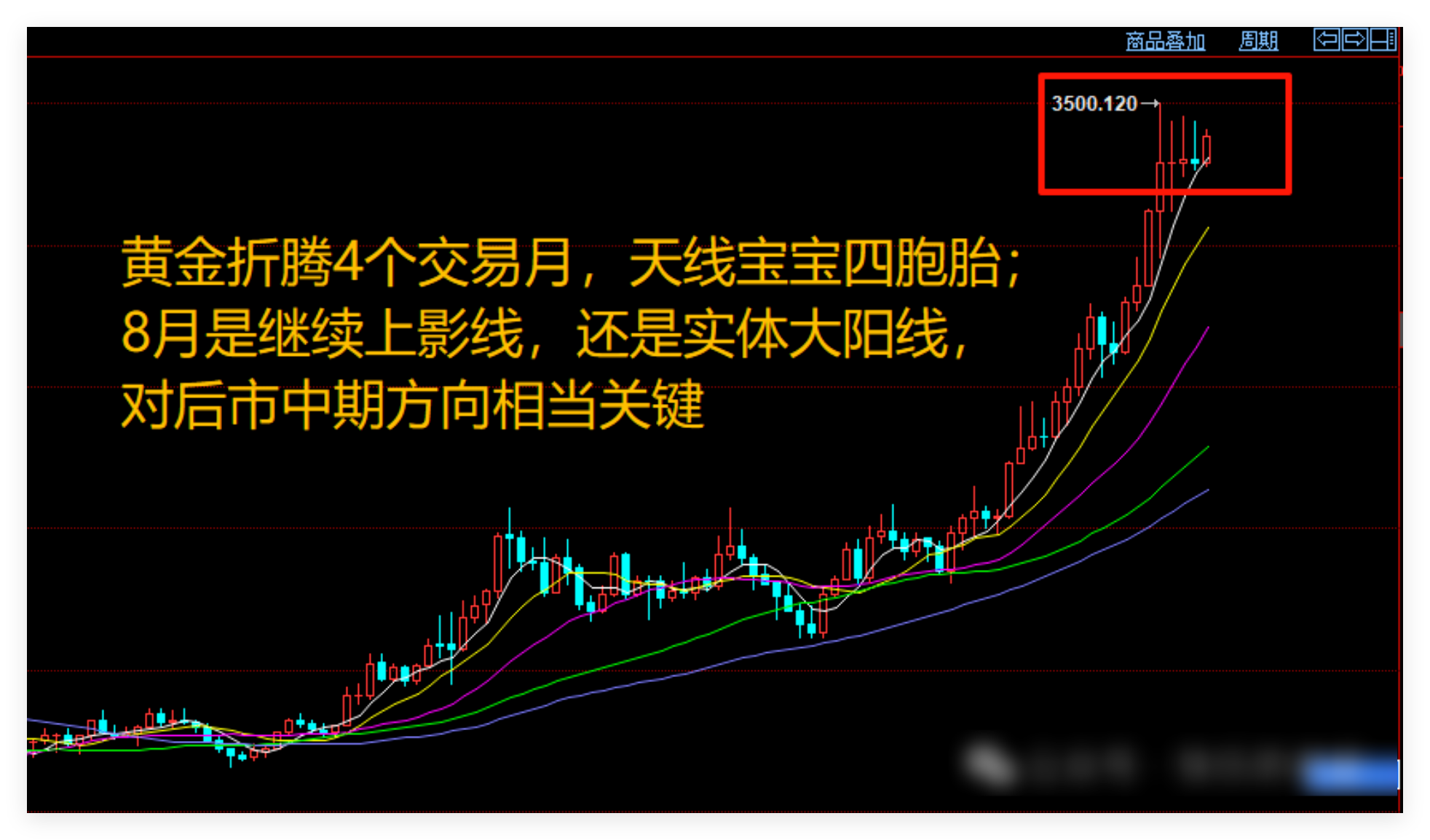 就技术面而言,黄金8月月线如果继续上影线,那就是这两天需要暴跌比如3350破位,收盘3330一带或下方,越靠近3300大关信号越强烈,这样的话就是4根天线宝宝后又来一根,后市强烈看空,3270--3245大概率破然后跌向3150-3120及3000大关!