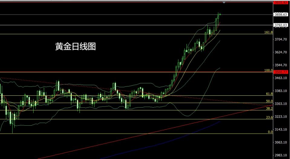 昨日黄金市场早盘开盘在3834.7的位置后行情回踩3824.9的位置后行情就开始拉升过程,日线最高触及到了3872的历史新高后行情盘中出现获利了结回落过程,日线最低给到了3792.3的位置后行情受到日线级别5日均线和基本面利多因素的共同作用行情完成V型反转,日线最终收线在了3858.4 位置后日线以一根下影线极长的锤头形态收线,而这样的形态收尾后,今日的行情在技术上有一定的看多需求,点位上,下方3325和3322的多和上周3368-3370的多和3377和3385多和3563的多减仓后止损跟进在3650持有,今日先回落给出3832多止损3826,目标看3862和3872,破位的话看3885和3893和3902和3910附近。