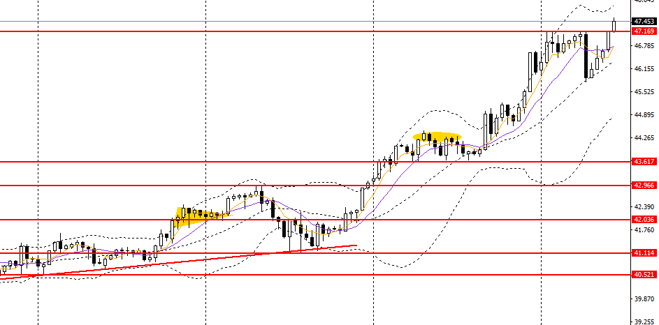 白银收锤子阴线,今日亚盘继续破高,日线RSI仍位于超买区,4小时再度站上平台压力47,上行空间打开,47.20上方可维持多头思路,后市预计将挑战48。