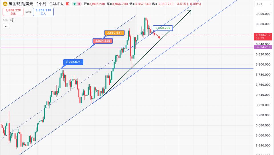 受8月1日公布的美非农就业数据疲软表现影响,金价逐步摆脱震荡走势,8月底金价开启单边上行形成的对3400向上突破走势,自此再度开启连续单边上行破位走高。美联储9月利率决议的落地并未缓和市场担忧情绪,金价短暂调整后恢复涨势。进入本周受美政府停摆影响,金价连续大幅冲高最高上探3895一线后震荡回落,当前金价回落企稳于3850上方。短线走低并未表现出空头强度上升,连续冲高需警惕多头阶段性盈利了结引发的价格下行。日线级别显示金价自8月22日以来形成对日线级别均线向上突破走势,整体日线移动平均线维持较为规整向上发散多头趋势指引参考,连续冲高日线级别RSI呈超买表现,需警惕高位回落日线级别调整走势。小时级别显示,短期金价震荡走低逐步完成小时级别RSI均值回归,当前金价企稳于小时级别60日均线支撑位价格上方,维持偏多震荡指引参考,短线下行做上涨趋势调整行情参考,回落幅度扩大仍将面临较为密集指标支撑位影响。四小时级别MACD随着短线回落出现高位死叉表现,四小时级别见顶表现逐步显现,短期金价继续扩大回落风险预期逐步上升。(本周五非农就业数据受美政府停摆影响有较大概率延期公布。)若本周非农数据继续录得符合预期或低于预期表现,仍将解读为有利于美联储进一步降息,将继续形成对金价提振影响,低于预期的幅度将成为金价上涨幅度的决定因素。若非农就业数据高于预期,将缓和市场悲观氛围,金价延续震荡走低扩大回落逐步带来四小时级别、日线级别调整走势预期较高。综上述,当前回落逐步显现多头疲态,中长期上涨趋势稳定,短期支撑回踩预期逐步上升。谨慎围绕多单做主要交易思路展开,针对短期回落以逢低多交易为主。下方关注3830、3795、3710。
