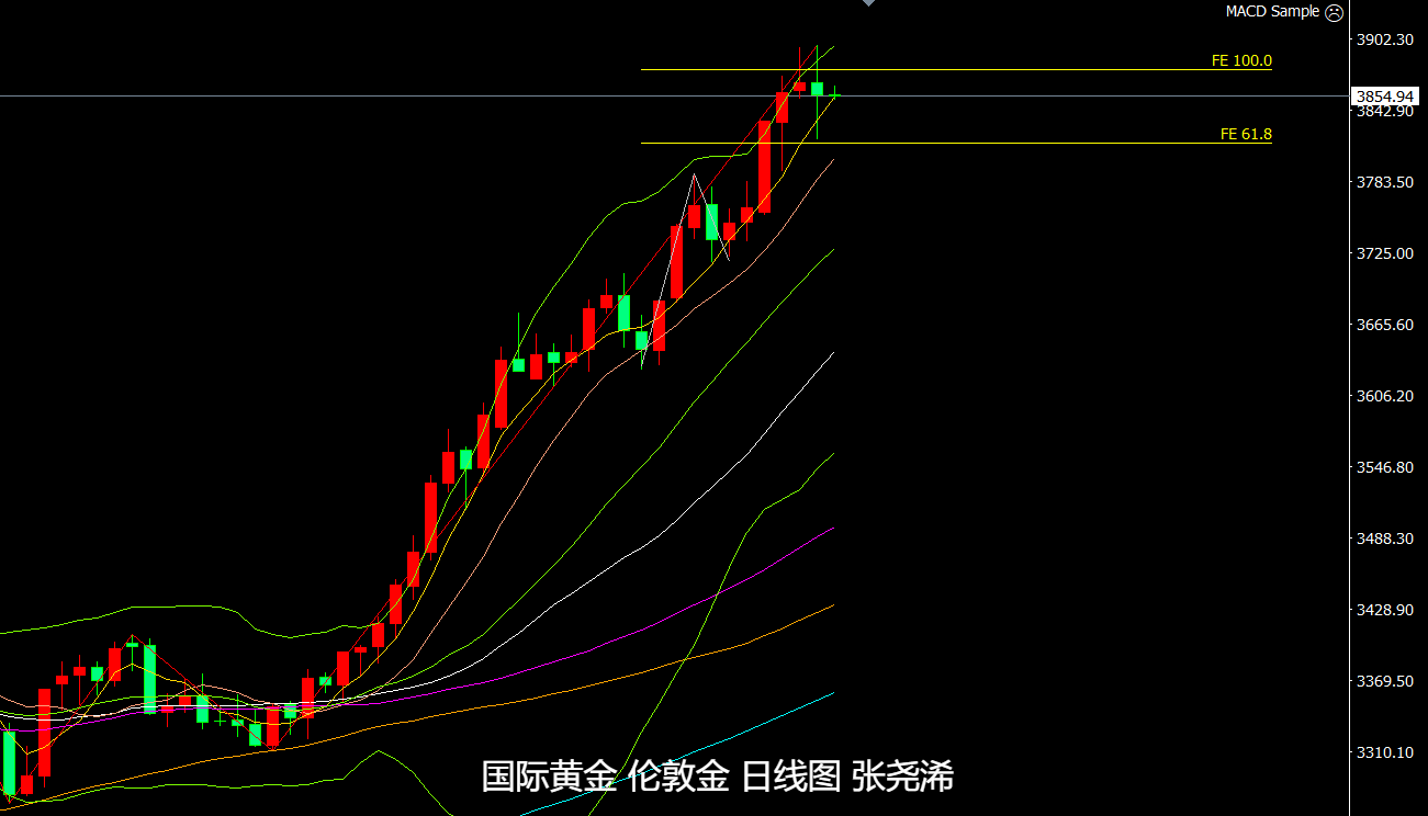上交易日周四(10月2日):国际黄金震荡十字收跌,相对于周三的倒垂形态,再度增强了反弹见顶看空的预期,但走势仍未跌破5日均线支撑,走势仍保持向上倾向,那么在跌破3800美元关口之前,仍先维持震荡待上行攀升的趋势发展。