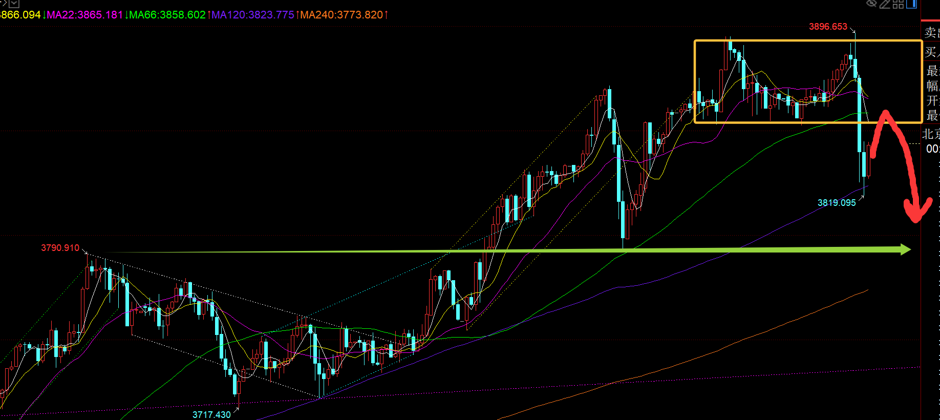 第一,黄金日线级别: 昨日冲高回落收报长上影承压K,今日仍是冲高回落,且打压力度比昨日大,目前形态是阴线,算是回踩确认了5均线3830-20,也是白天所提及的波段看跌目标位;原本这里是可以计划反手看涨企稳,但由于后半夜了,也就暂时放弃了,因为这两日的走势形态几乎出现和9月16日、17日一致,都是先顶部上影线阳K之后,紧接着收阴,低点回踩5日,那么按照此循环,周五就大概率会试探10均线附近,预计上移3800-3790范围,这里出现日内横盘稳定企稳信号,则可以回归继续顺势看涨去一路走高;若10均线大阴又继续失守,那么就会进一步下跌,去靠拢中轨或刺破中轨做一次稍大的修正,毕竟从3311底部开始至3897,这一波接近600米涨幅,中途还没出现像样的回调,像9月17日、9月24日那样的都不算正式的回调,更多是倾向于高位箱体强势整理,因为10均线未有效失守,它就一直处于逼空状态;因此,总结下,日线级别明日先去测试10均线,继续看短期回调修正,大概3800-3790;若守住10均线,则下周继续回归顺势看涨;若守不住10均线,则进一步下调,会是自3311底部以来首次出现的稍大回调修正,指向中轨或刺破中轨后,再企稳一路单边走高,再往上就是站上3900去冲击4000关口;