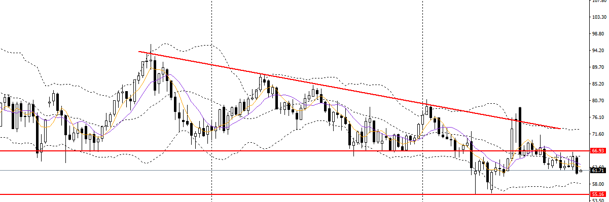 美原油上周拐头下行,承压于5周均线,波段有望延续震荡偏弱格局。周五收十字星,今日跳空上行,日线RSI上扬,空头动能减弱,多单仍可持有,后市可上看至62。