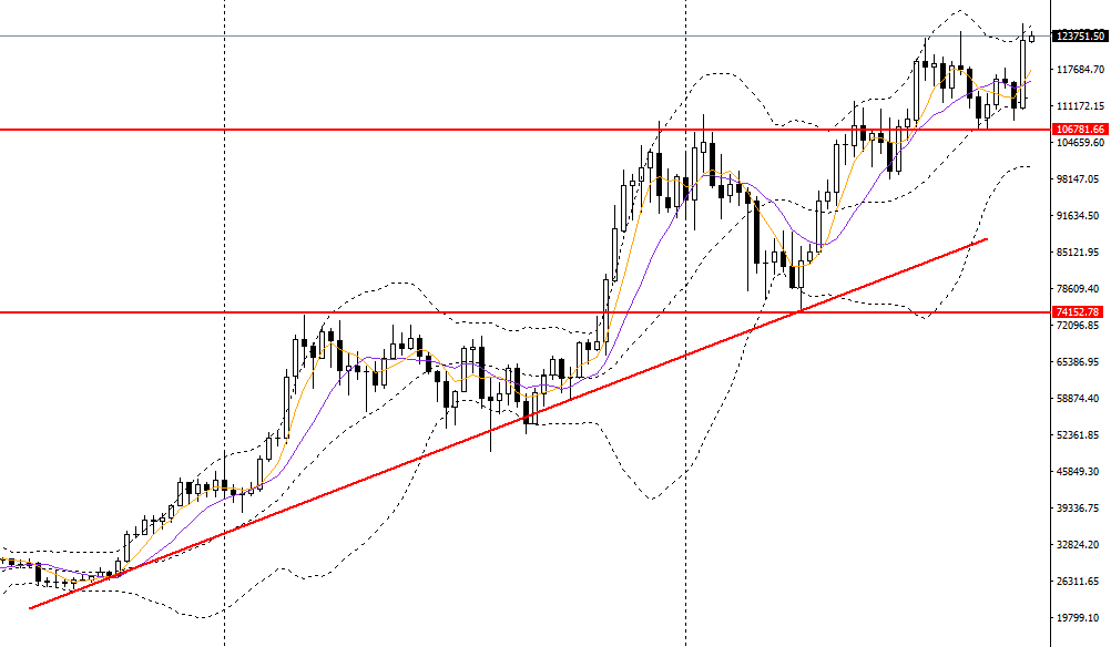 比特币上周再创新高,刺破周线布林上轨,RSI位于50之上,波段预计将继续走高。昨日收倒锤阳线,立于5日均线上方,日线RSI位于高位,如彻底站上125000,后市预计将挑战130000。