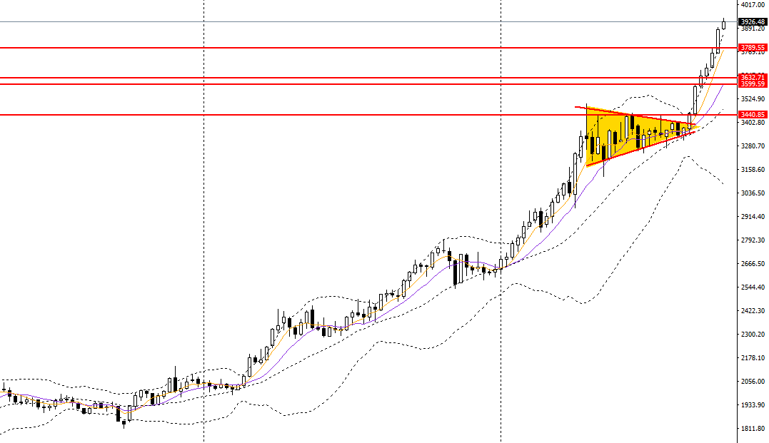 黄金连续多周上行,站上周线布林上轨,RSI到达超买区,波段预计将继续走高。周五收小阳线,今日亚盘继续冲高,日线RSI再度到达超买区,4小时立于上行趋势线上方,上破上升三角形,如回踩3925附近企稳可做多。黄金/人民币如于902附近企稳可进多。