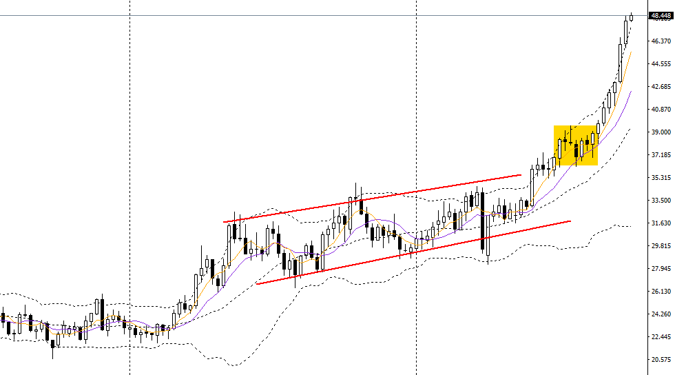 白银上周大举上攻,5周、10周均线乖离率上升,波段大概率将延续上行。周五收看涨吞没阳柱,立于5日均线上方,4小时升破此前震荡区间,48.30附近企稳可继续做多。
