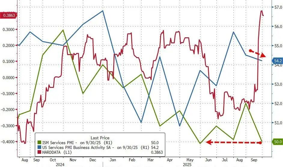 尽管非农数据放假了,欧洲和美国的9月PMI指数如期出炉。美国9月ISM非制造业指数50,大幅不及预期的51.7,前值52。50为荣枯分水岭。9月ISM服务业PMI低于媒体调查的所有经济学家的预估。分析指出,作为美国经济最大组成部分的服务业表现令人失望。但美指和美国国债收益率对此反应有限。