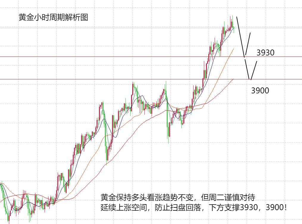 先说结论,黄金继续保持多头趋势看涨,交易依旧是回落做多,但周二谨慎对待多头的延续性,可能会出现上周二类似的修复性大跌。在市场的作用下,现在黄金走的太恐怖了,连续三周,每周的周一都走出极限的单边大涨,本周一黄金从3880到现在的3976又走了接近100个点,现在高点距离4000只差一点点了,我们回顾一下上周的表现,上周一走出单边大涨,周二小幅上涨后在美盘出现了大跌,全盘上下有接近80美金的空间,所以,即使今天是绝对的多头强势,也要注意是否会出现类似的走势,看今晚是否有同样的下跌。从技术面上看,今天的上涨高点也只有一个4000可看了,上涨不猜顶,没有其他的高点可参考,而下方的支撑要谨慎对待,下方有3930,3900两个关键支撑点,如果亚欧盘不破这两个关键点可以顺势做多,但如果今天跌破3900,走出上周二的下跌空间,那今晚黄金可能有一波大跌,下方或看3850。因此,今天的交易思路很明确,趋势之下,肯定是看涨,交易以回落做多为主,但在极限高位之下,谨慎的对待现在的上涨,防止市场高位获利结价,走出回落大跌空间。