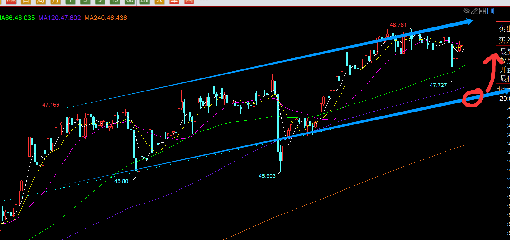 白银方面:从图中通道看,上轨一直承压不上,今日横盘之后,欧盘出现一波急跌,可惜并未给到下轨看涨机会,当前几乎V回去了;今晚继续关注上轨48.9之下阻力,下轨47.37上支撑,中途48附近也有一定支撑,回踩企稳继续看涨为主;