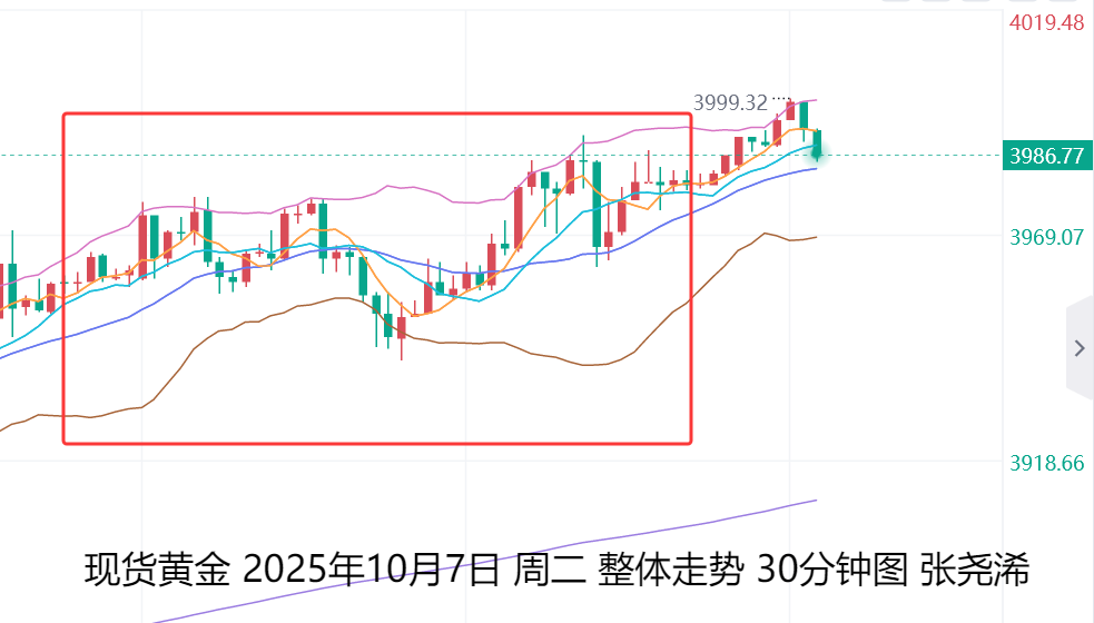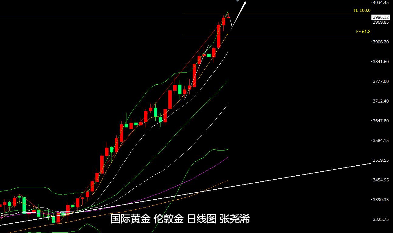 上交易日周二(10月7日):国际黄金继续反弹走强收阳,进一步向今年6月份金价还在3400美元的时候就给出的看涨目标4000美元上方的前景迈进,目前来看,多头动力未有减弱迹象,暗示在突破4000关口之后,还将继续上行,有望冲击4100美元以及4200美元。