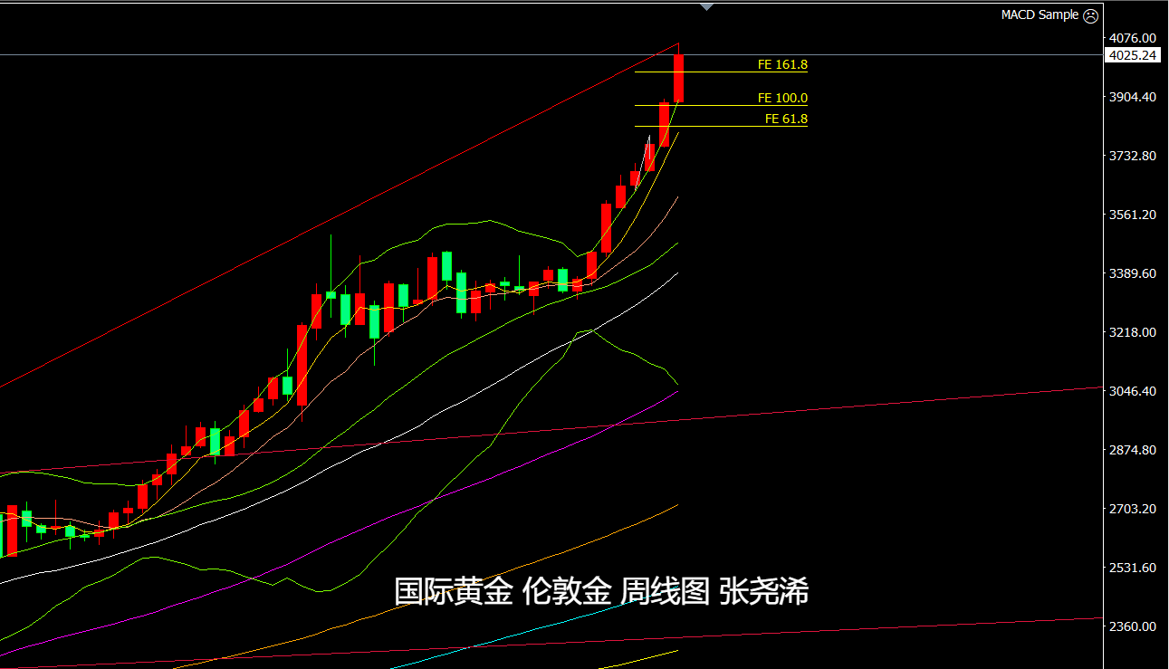 周图,金价自去年开涨攀升以来,如期第4次回踩中轨线支撑,并再度展开持续向上攀升的多头行情,不断到达给出的看涨目标位,本周目前强势运行在布林带上轨之前,暗示短期后市面临一定的回调风险,但由于目前仍持稳多头未能偏向收取倒垂见顶形态,故此,如有回调,也是下周,就算回调也同样是做多机会。