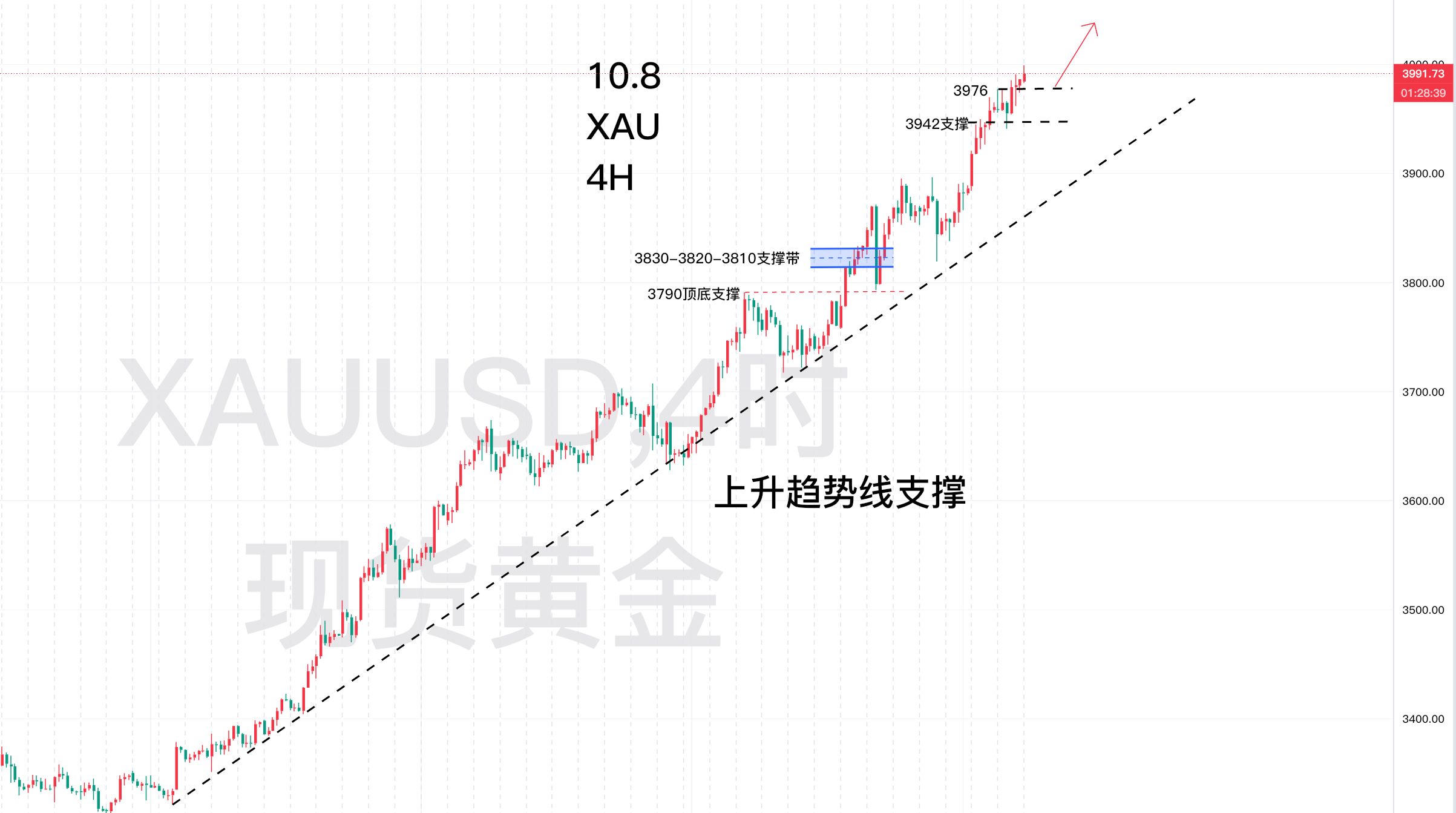 上交易日周三(10月8日):国际黄金继续强势反弹收阳,受到美国政府“停摆”危机持续发酵,避险资金源源不断地涌入而突破4000美元关口刷新历史高点,多头动力持稳,虽然有回调风险,但鉴于看涨前景良好,回调也将是震荡调整的入场机会。