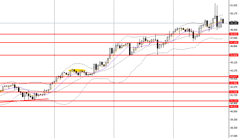 白银冲高回落,仍立于5日均线上方,日线RSI位于超买区附近,49-49.20一带企稳可继续进多,如站上50,后市有望再度挑战51。