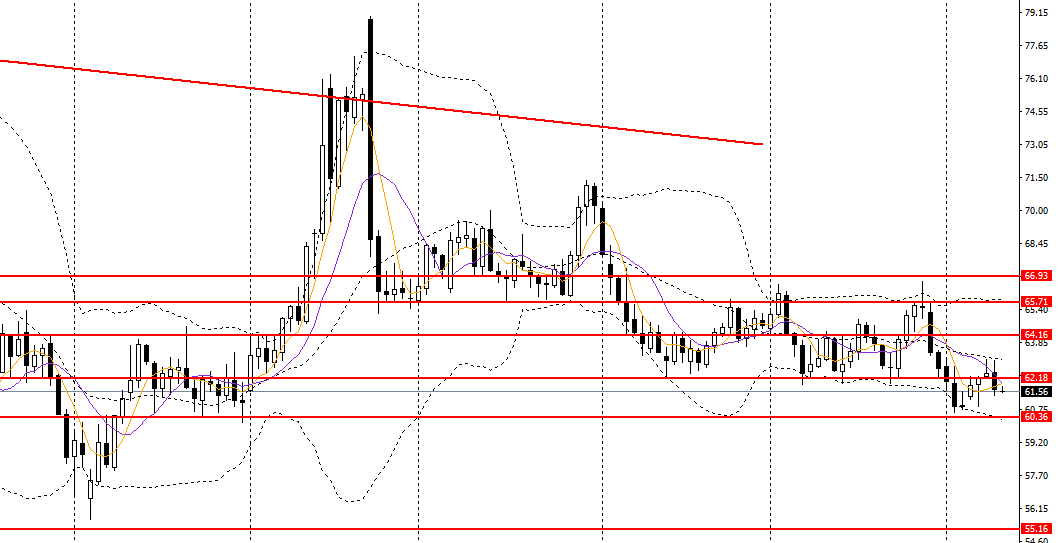 美原油收长阴柱,承压于5日均线,4小时下破62附近支撑,如于62一线承压可进空,后市预计将回踩60。
