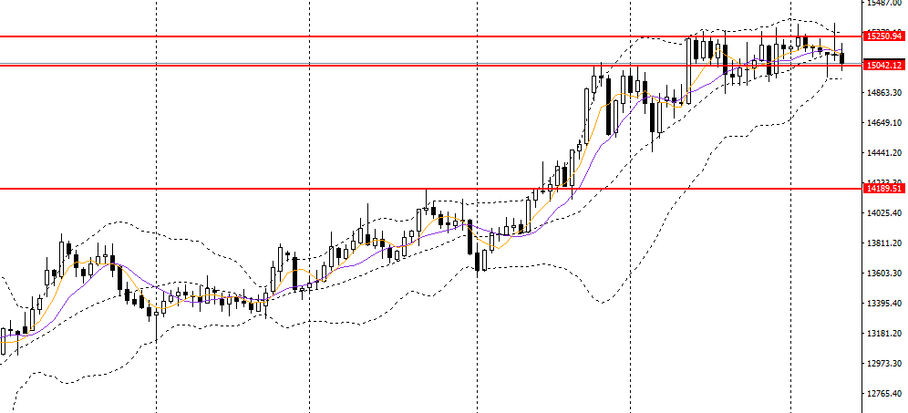A50收十字星,刺破前高,徘徊于5日、10日均线附近,4小时仍未有效上破15200附近压力,短线预计将维持高位震荡格局,可保持观望。