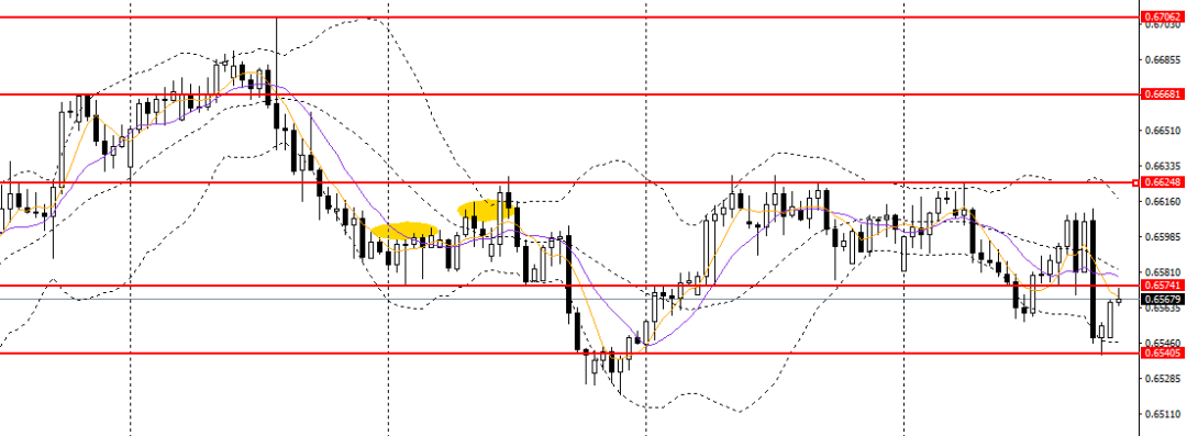 澳美收看跌吞没阴线,承压于10日均线,日线RSI跌至50附近,4小时于0.6540一线支撑企稳,空头动能减弱,空单可暂时离场,稳健者建议观望。