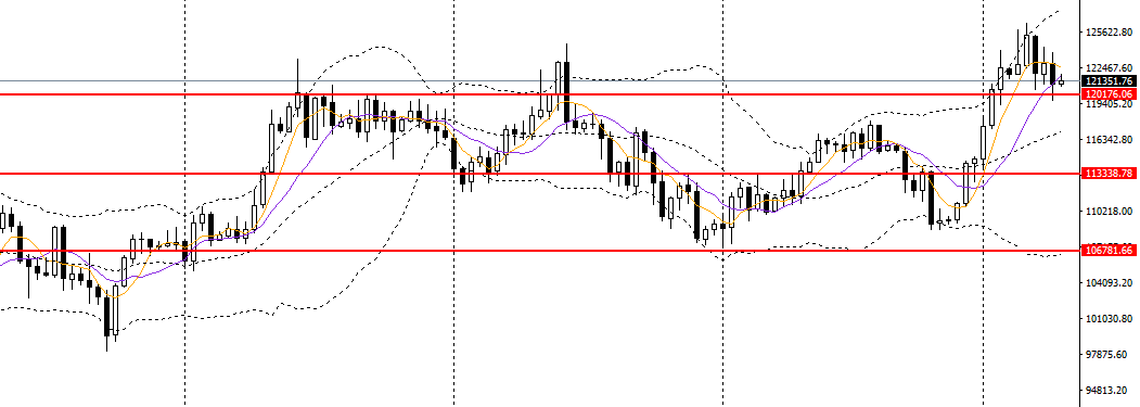比特币收长阴线,下破10日均线,4小时刺破120000关口支撑,短线趋势转弱,如继续承压于124000下方,短线仍以看空为主。