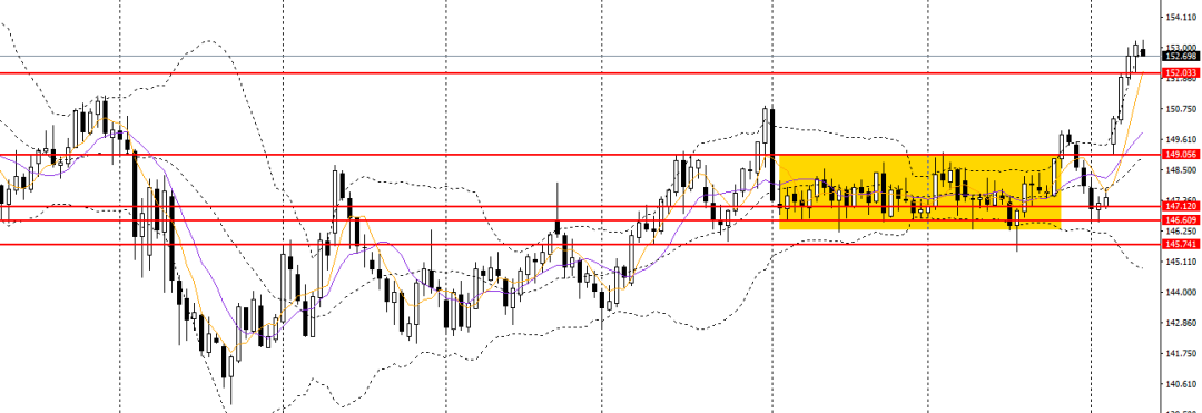 美日持续破高,日线RSI仍位于高位,但4小时多头力量有所减弱,高位谨慎做多,如于152.40附近再度企稳可做多。