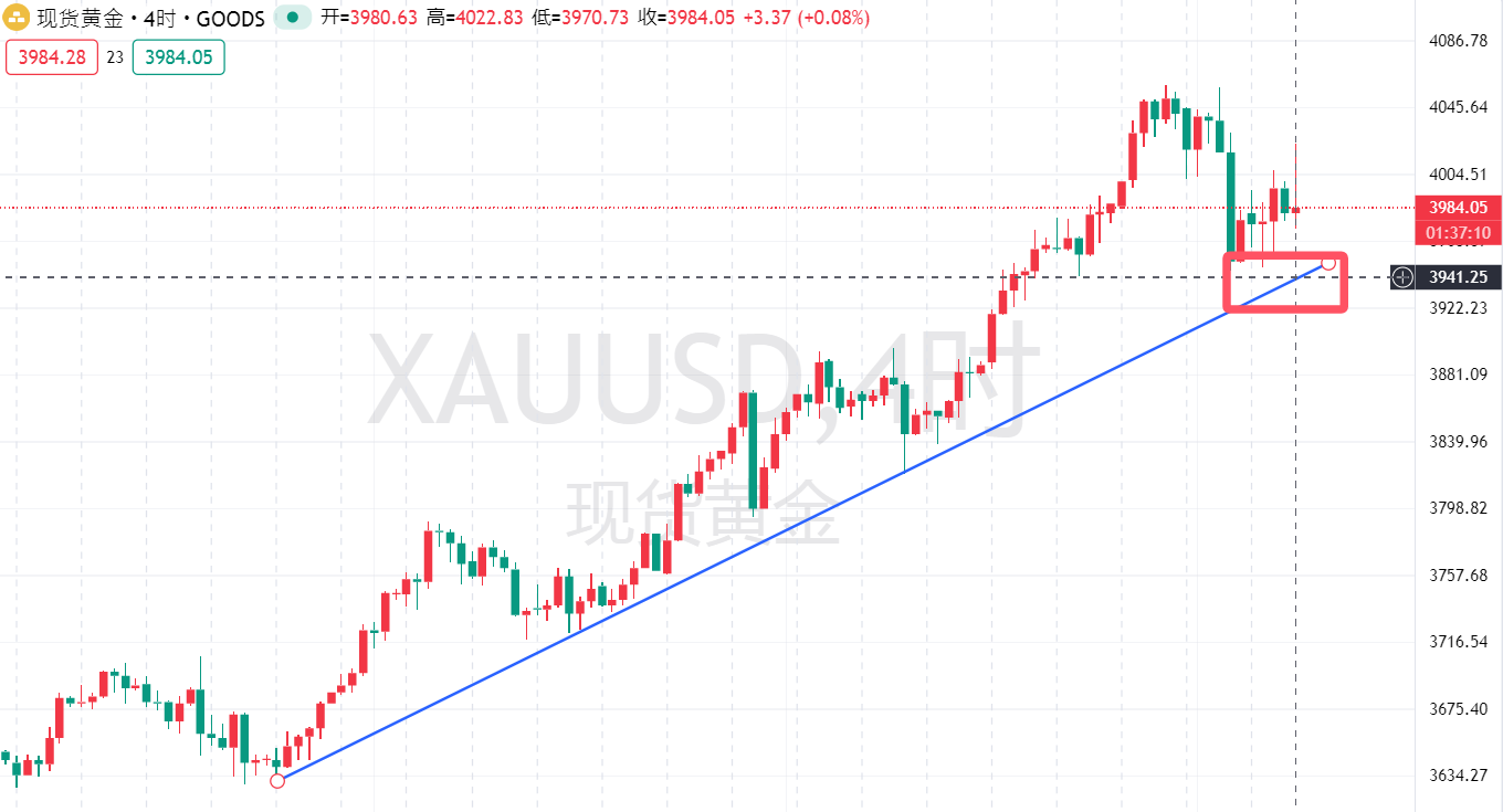 4小时图来看,后半夜多空聚焦的焦点在于3940争夺。一旦行情击穿3940,那么上升趋势线向下破位,后半夜就是继续加速下行,下方首要目标直指3900下方甚至是3815也不是不可能!!!