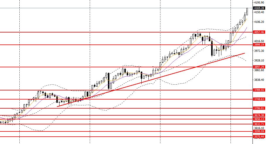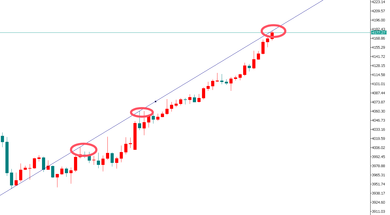 2、作用力明显的4090区域,叠加多重作用力,隔夜最后确定支撑点和起涨点,今日急跌的止跌点,上升通道线沿线上轨