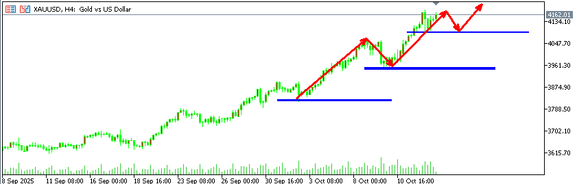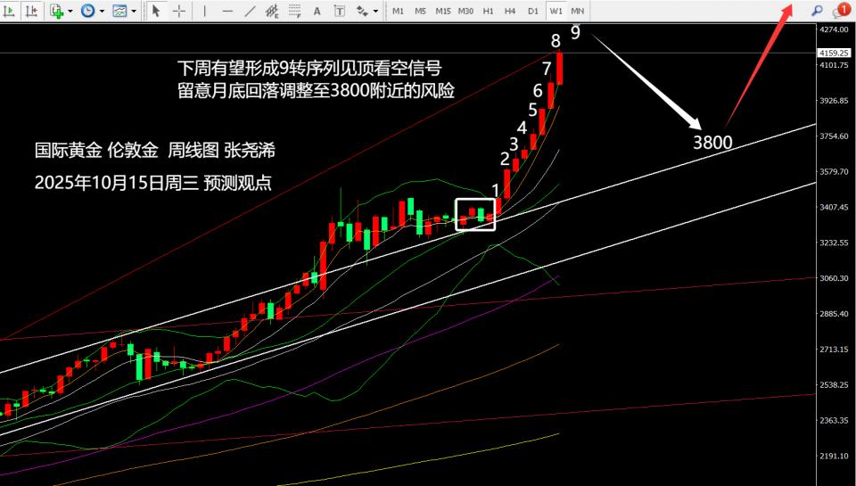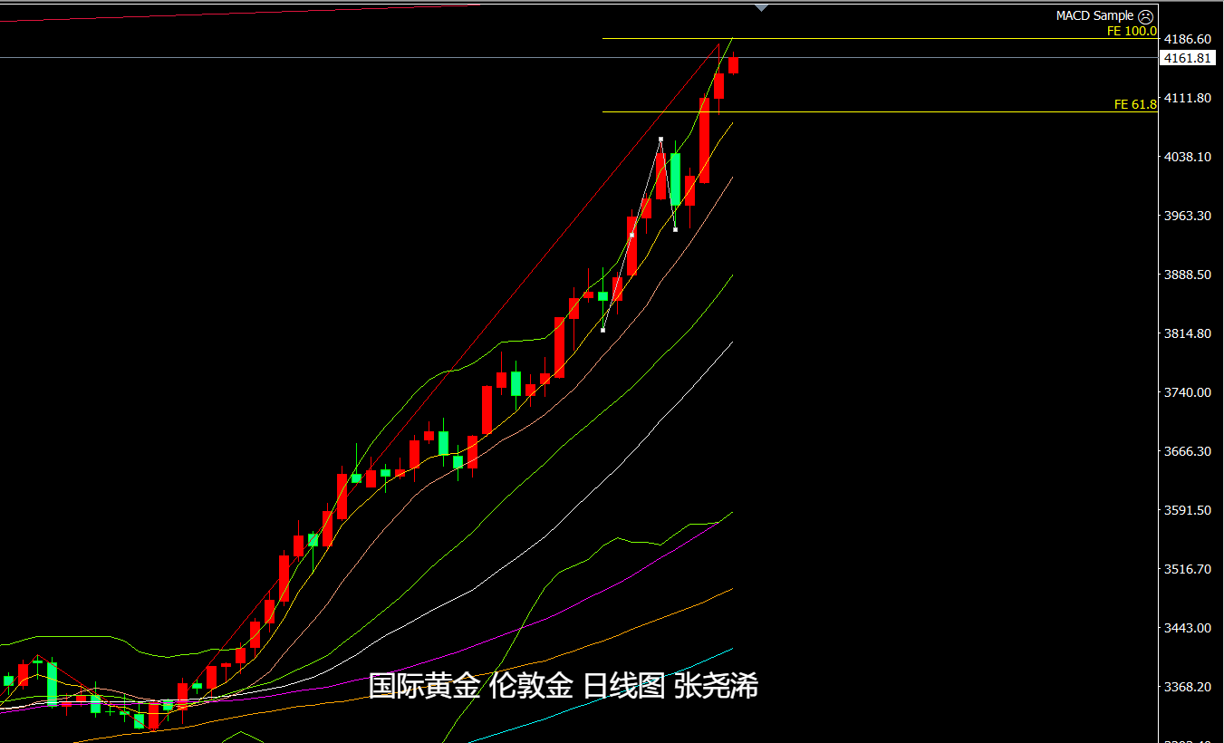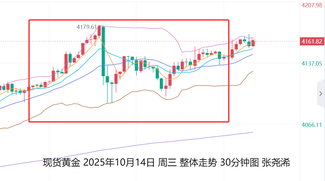 上交易日周二(10月14日):国际黄金震荡收涨,继续刷新历史高点,虽一度跳水转跌,但多头仍表现持稳,也未能跌破支撑,以及收取见顶形态,回踩支撑再度入场的多单也是获利颇丰,故此,后市来看,将继续保持看涨等待触及4200美元关口。