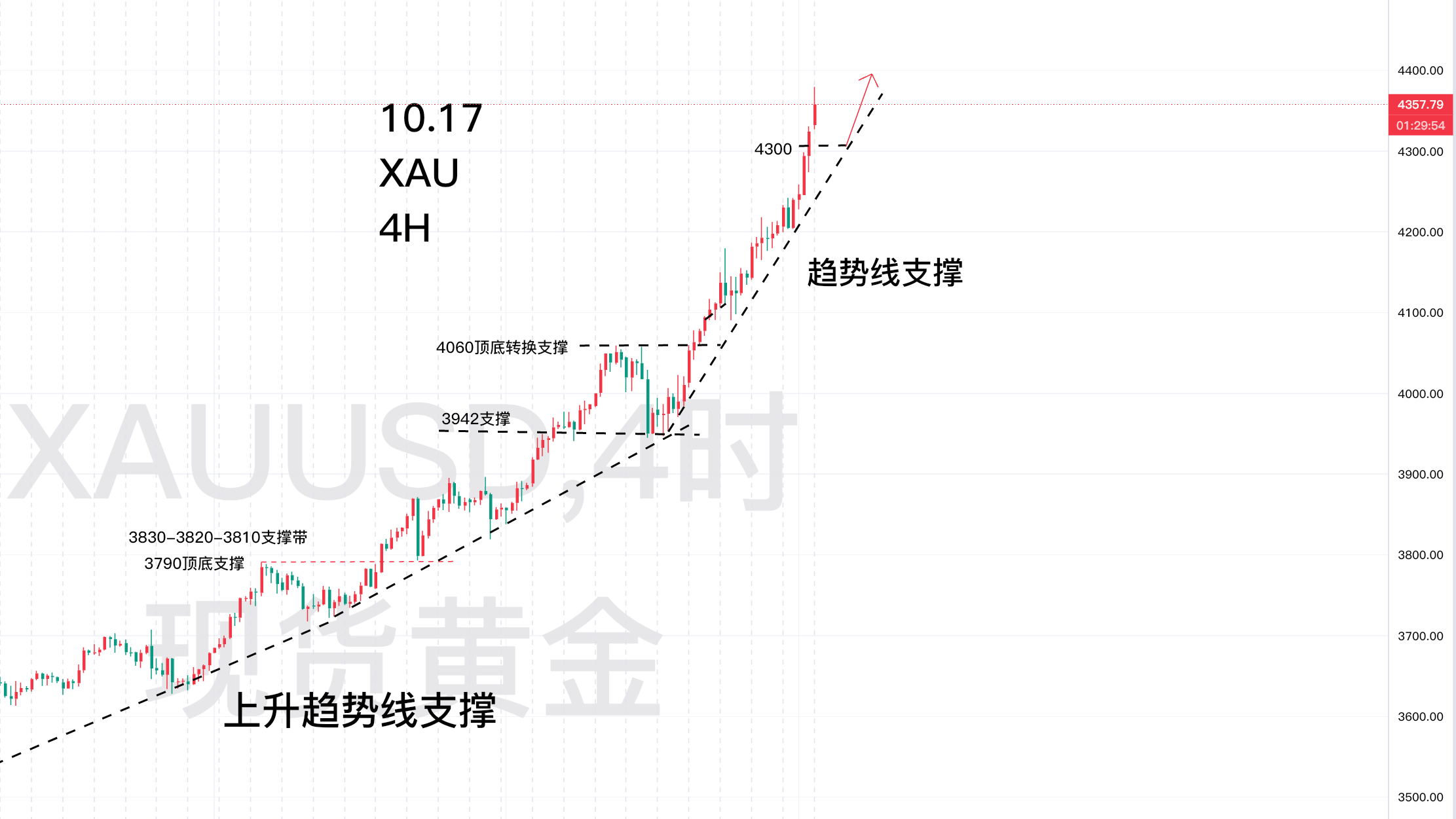 展望今日周五(10月17日):国际黄金开盘微幅高开后直接走强,进一步刷新历史高点,但多头动力有所减缓,受到月图级别的阻力压制和获利了结影响,而有所观望,如今日收取阴包阳,短期有望迎来200美金左右的调整空间,但如继续反弹收阳,则有望继续走强。并影响本月的收线情况,使得本月难以遇阻趋势线压力,令其直接冲击5000美元关口。
