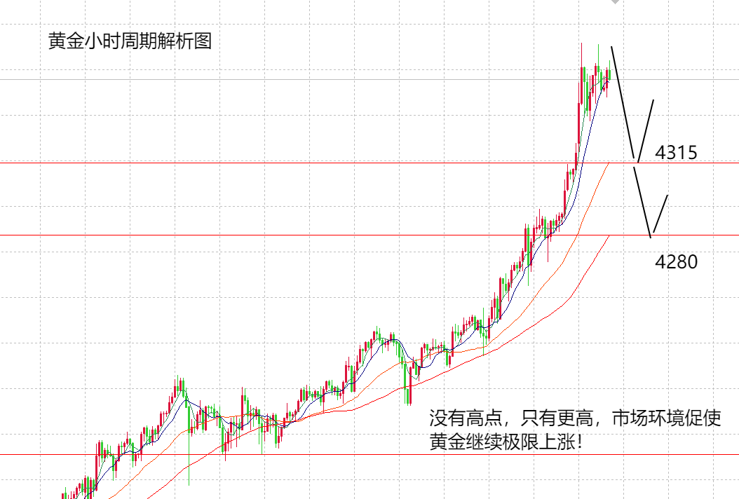 一大早起来以为自己看错了,本来昨天提示大家,黄金周四可能看涨到4300就觉得已经够高,够大胆了,但市场没有高点,只有更高,直接上冲到4380,周四单日单边大涨了接近200美金,这是什么概念,2025年的黄金市场已经接近疯狂了。在破位4000后,山海提示大家,这波看涨或到4200,4500,接下来的高点也只有一个4500了,不用分析,不用看过多的参考,慢慢等4500高点。白银在破位53.5后,看55高点,现在最高在54.5附近,也有达到目标的预期。周四在相对高点做了两波回落,一波顺势多,利润比较满意,看本周尾盘是否延续状态,做好最后一个交易日。