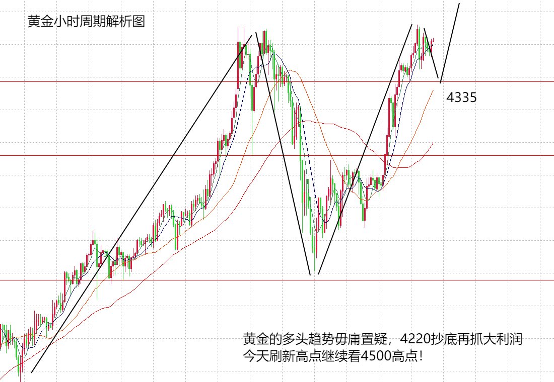 仅需一个交易日,黄金就从4220上涨到4380,单日单边上涨了170美金,完全吞没了上周五的调整空间。周末还有很多粉丝留言问山海,黄金是不是改变了趋势,是不是要走出大跌,山海很坚定的告诉大家,今年黄金绝对是多头趋势,任何调整都是给大家做多的机会,上周五山海提示黄金抄底,周一再次提示在4220抄底,等待本周的大涨空间,目前结果明显,再次验证了山海的看法和实力。周一午夜黄金高点在4380,目前价位在4370,今天不用做过多分析,还是强调趋势的重要性,在明确看涨之际,只需要考虑什么点位做多,或者大概率今天回涨到哪里。从技术面来看,暂时处在4380前高,午夜试探没有破位,市场如果表现友善的话,今天亚欧盘可能回落到4330附近再继续上涨,破位4380后,就看4400,4450,如果直接上涨,破位4380,就很难再跟上多头的上涨节奏了。不过我们可以观察到,虽然暂时是绝对的强势,但每个交易日,不管是欧盘还是美盘,都有一波回落空间,所以,看涨不追多,一定要在合理的价位做有效的多单。