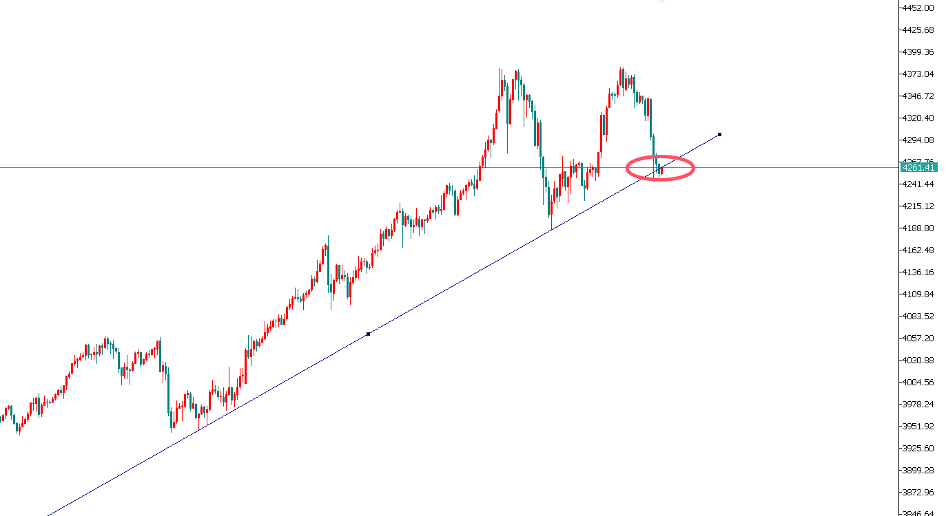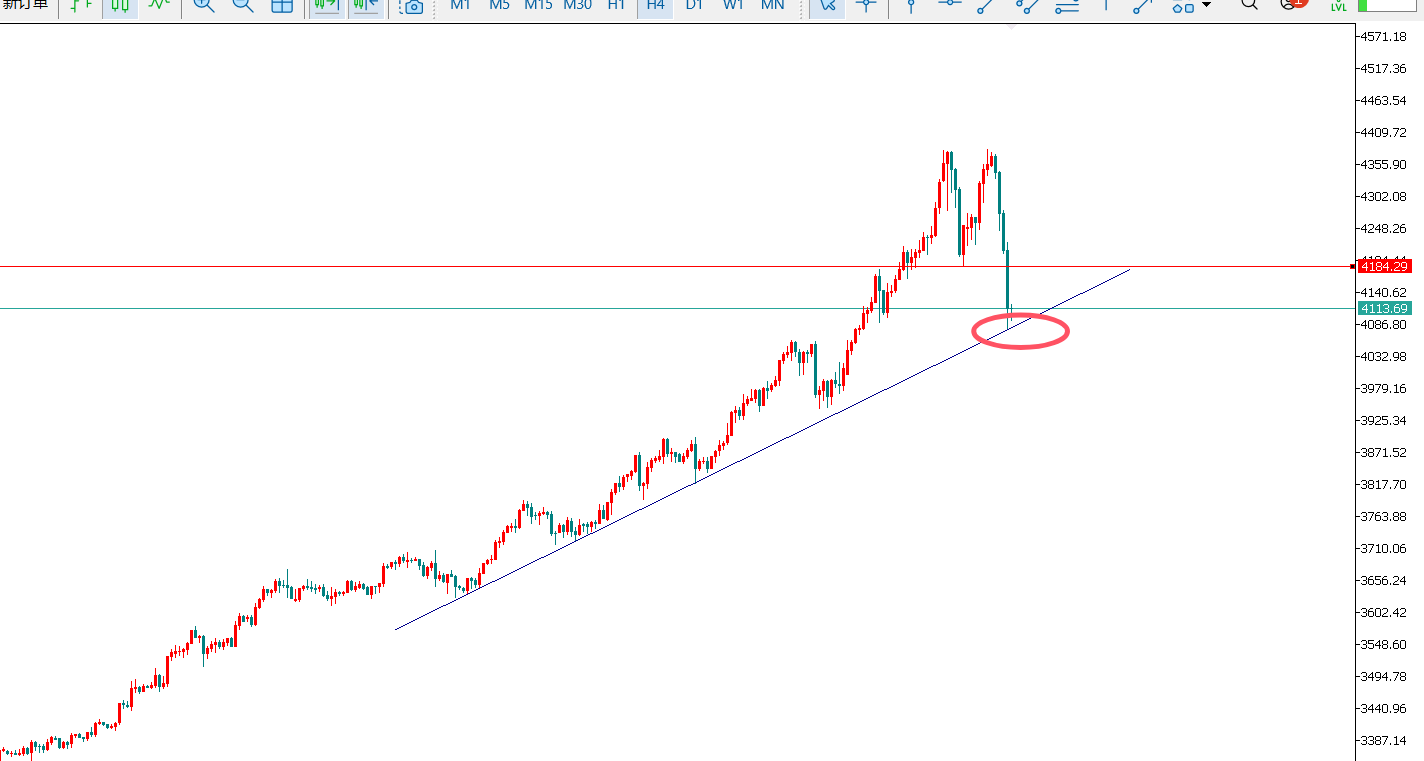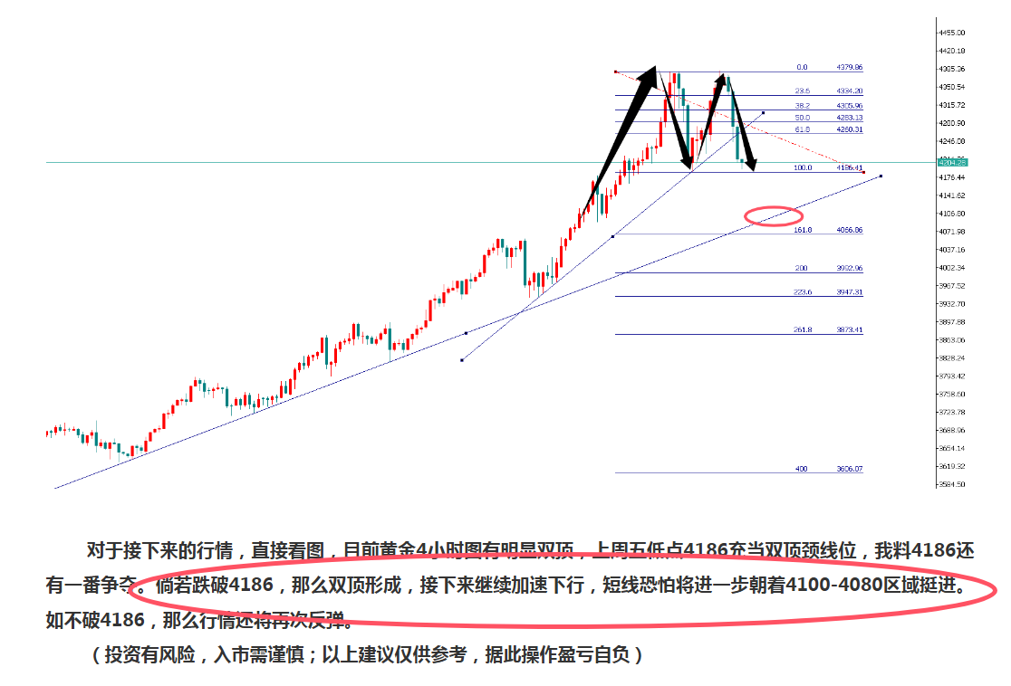 对于后市的行情来说,目前盘面正好到达我们预期的4080,这里正好是上升趋势线支撑,一旦破位,那么整体上升势头也就终结了,后市将进入进一步加速下行阶段。而目前黄金日线300美元大阴线,我认为后市进一步下破的概率较大。