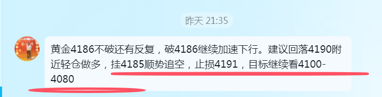 晚间会员提示的4185破位顺势追空完美到达预期目标,又是100美元收割,加上白天的空单,今天又是妥妥的大丰收的一天!!!