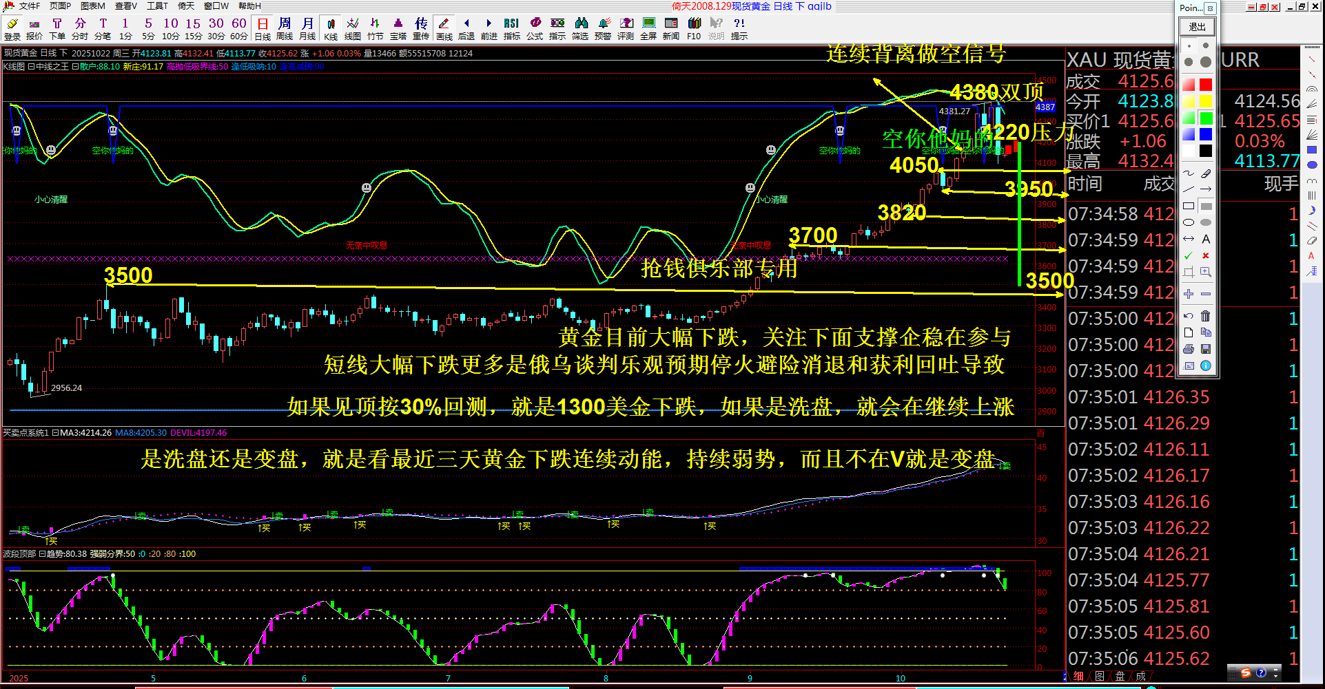 中线看涨给你画了个大饼,但是昨天一天跌了300美金,主力全跑了,你以为这个是散户能做到的实物不停诱多买入,其实期货市场空单不停补仓,突然一个大跌你就是站岗,至于什么时候解放那就是自求多福,首先最近俄乌谈停火预期乐观,而且欧盟也是声明支持现在的停火,就是俄罗斯花钱得到现在的土地,大家都是一个台阶停火,巴以和谈也是逐步实现,自然避险不在,在有获利回吐,必须快速波调整才能多空通吃。现在就是主力撤退你站岗,目前不要着急多是4000关口还是3820支撑走一半看一步,同时不要着急去接盘,昨天那么跌怎么也是观望下。现在压力4150到4200区域依然是短空。综合上述操作思路如下: