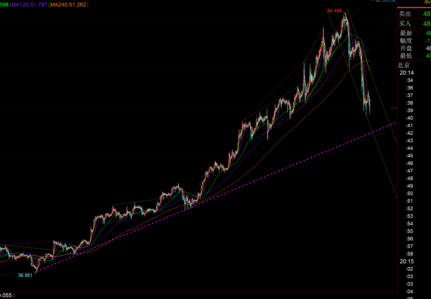 第一,黄金方面:昨日从4380直接砸到今日低点4004,创下历史单日最大跌幅记录;而这一波下滑就是开始选择去修正3311一路单边拉升至3481的涨幅;那么从低点3311到高点3481,分割一画,可以知道目前还没打到382分割位置3972,说明整体依旧维持强势拉升趋势,而快速打压修正反而是有利于后期企稳更好的去继续刷历史新高;一路慢跌阴跌下跌才可怕,急跌是不可怕的,因为它短时间内马上会结束抛售; 当前4004低点是逼近日线中轨,也逼近周线5均线,的确存在一定的心理关键防守,不过想要有效企稳,日线必须至少出一根底部大阳或较长下影K; 另外,它若下破4004,也可能会来一个假摔,就是先阴线下破于日线中轨,第二日或第三日大阳收回去,今年2月份和4月份都经常出现这种走法,这点也要留意,即便下去了,也不要慌,下方空间不会太大,4004之下,还有3945、3914等关键支撑;而日线上方阻力比较清楚,就是短期5日和10日会陆续成为反压,只有哪天突破站上5日,那么会回归趋势强势拉升阶段;