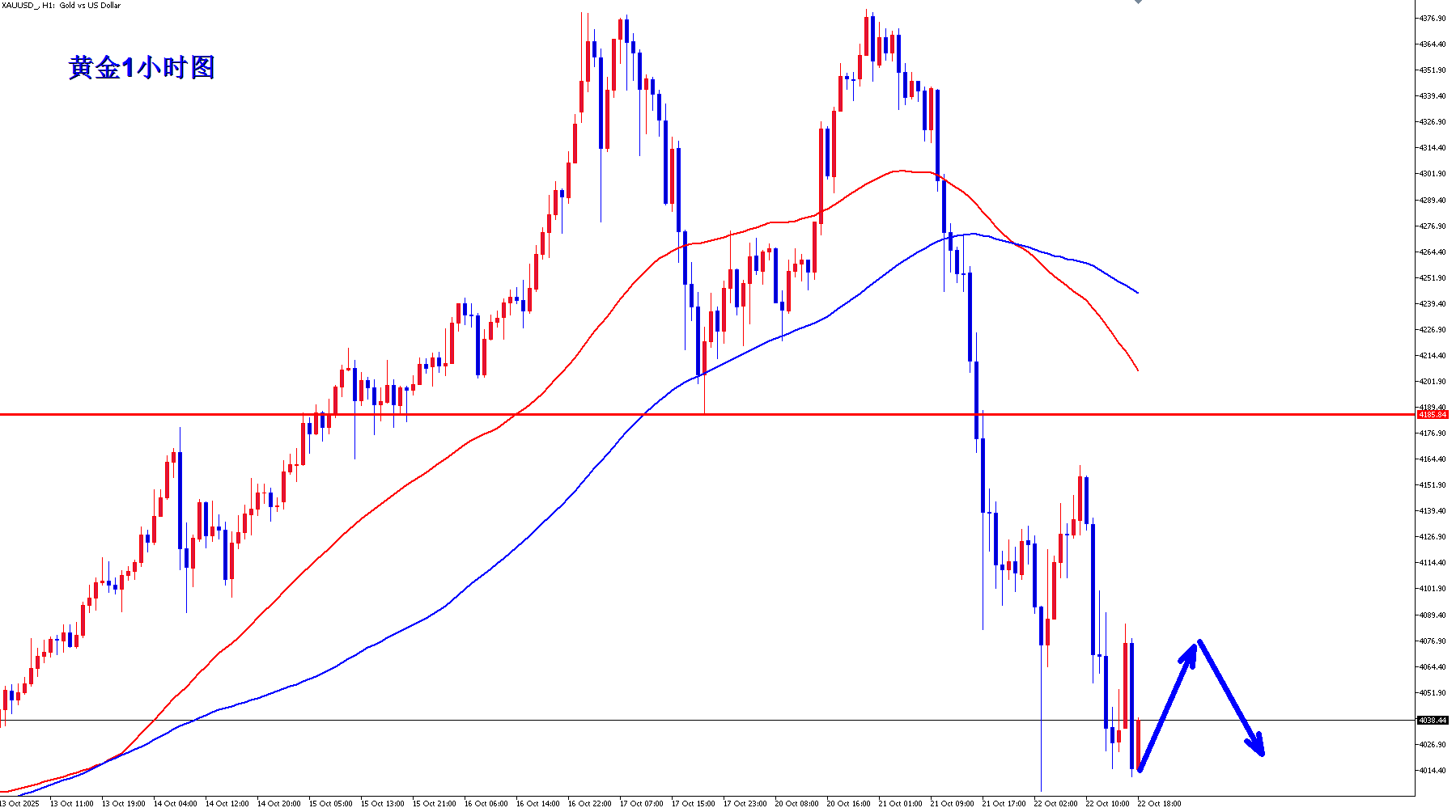 黄金1小时均线已经形成死叉向下的空头排列,黄金还有下跌动能,黄金今天美盘反弹之后还是继续快速下跌,可能黄金多头反弹的力度越来越弱了,黄金美盘反弹4085附近就直接掉转向下,黄金美盘反弹承压4085还是可以继续空。
